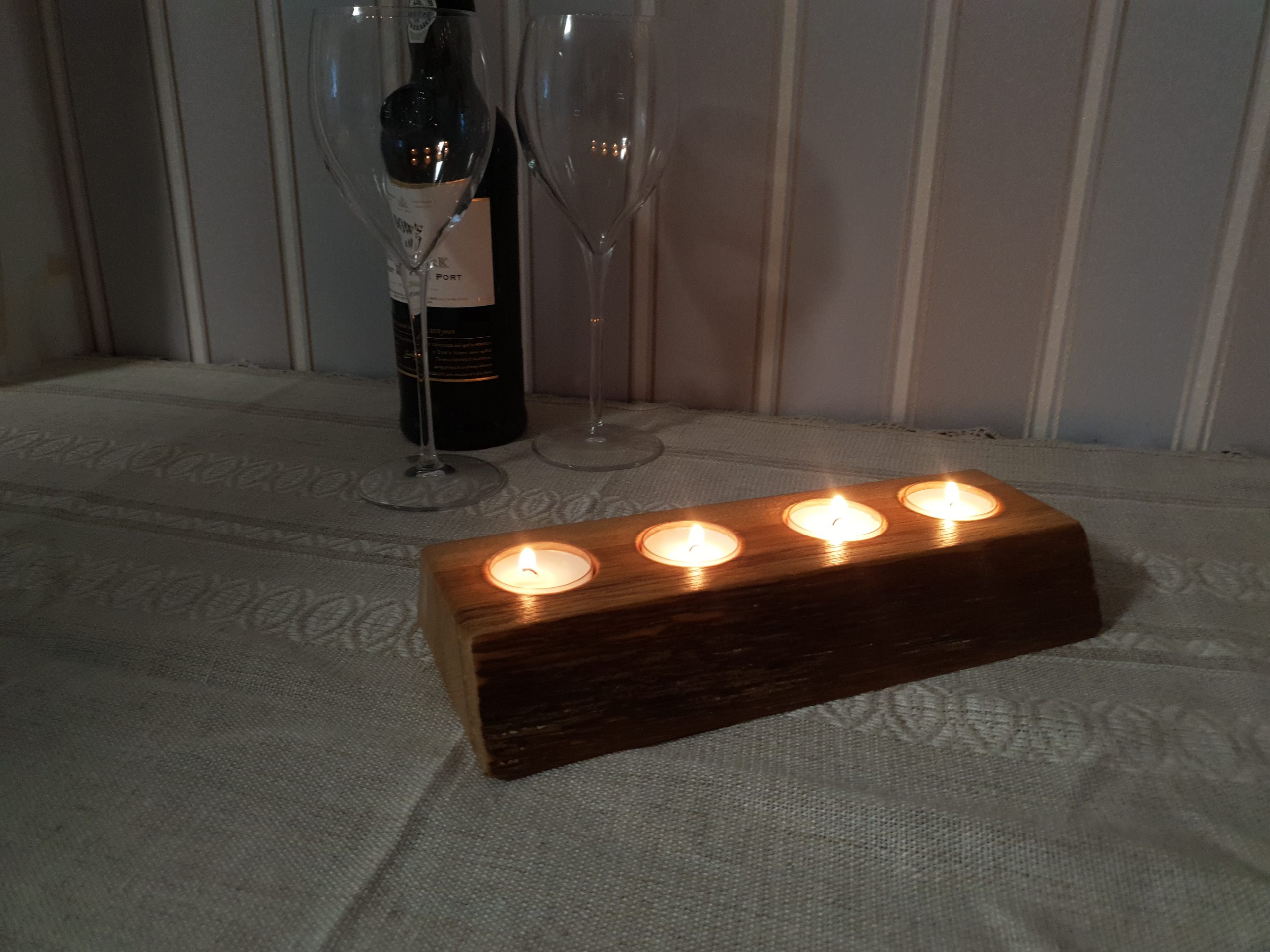 Tammepuidust tehtud küünlaalus millel on eemaldatud puukoor. Küünlaalus on viimistletud lakiga.
