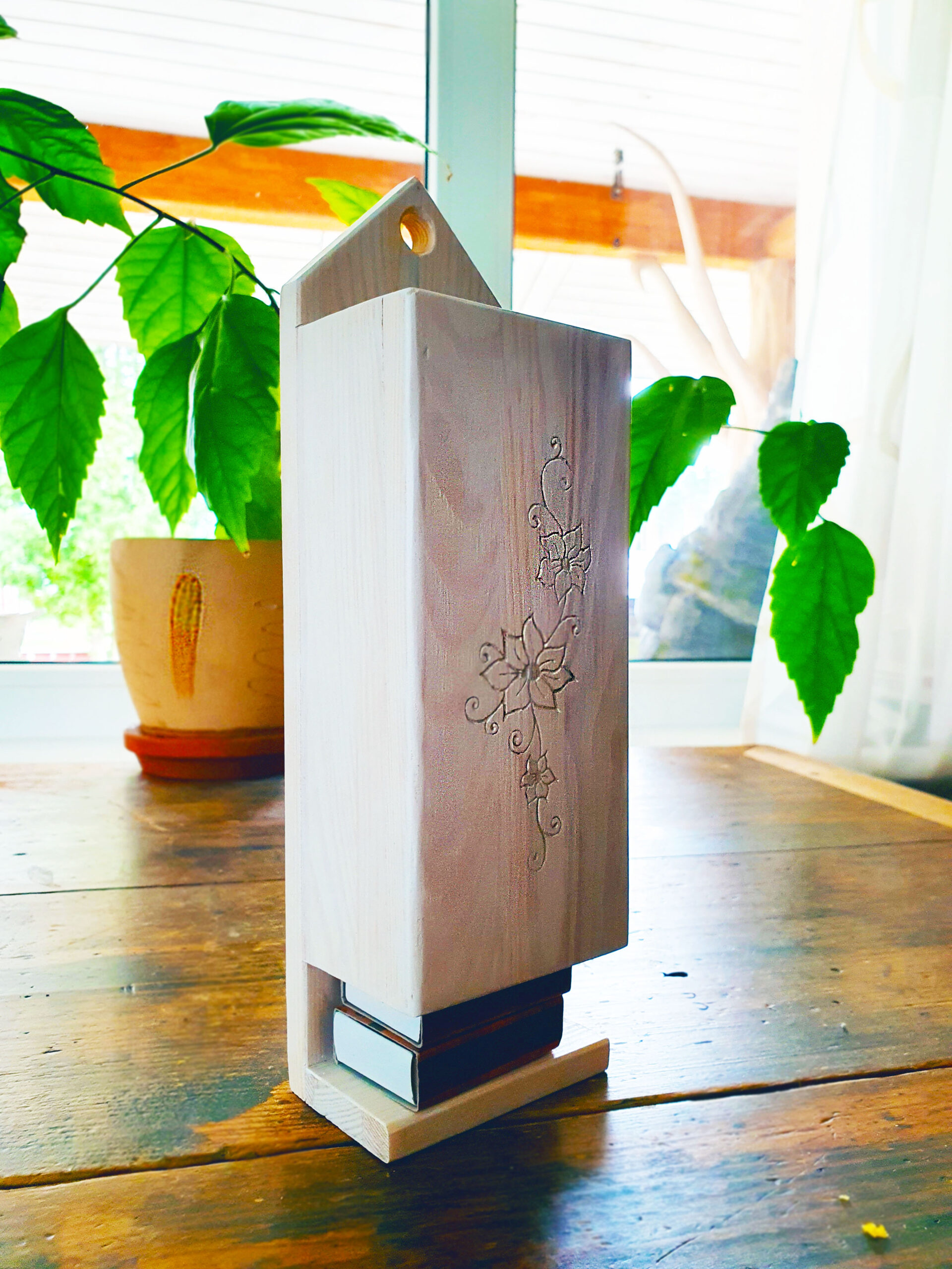 Tikutoosi hoidja on valmistatud männipuidust. Toode on viimistletud lakiga. Tikutoosi hoidka 12-le tikutoosile. Ülevalt paned ja alt võtad. Peale graveeritud ilus lille muster.